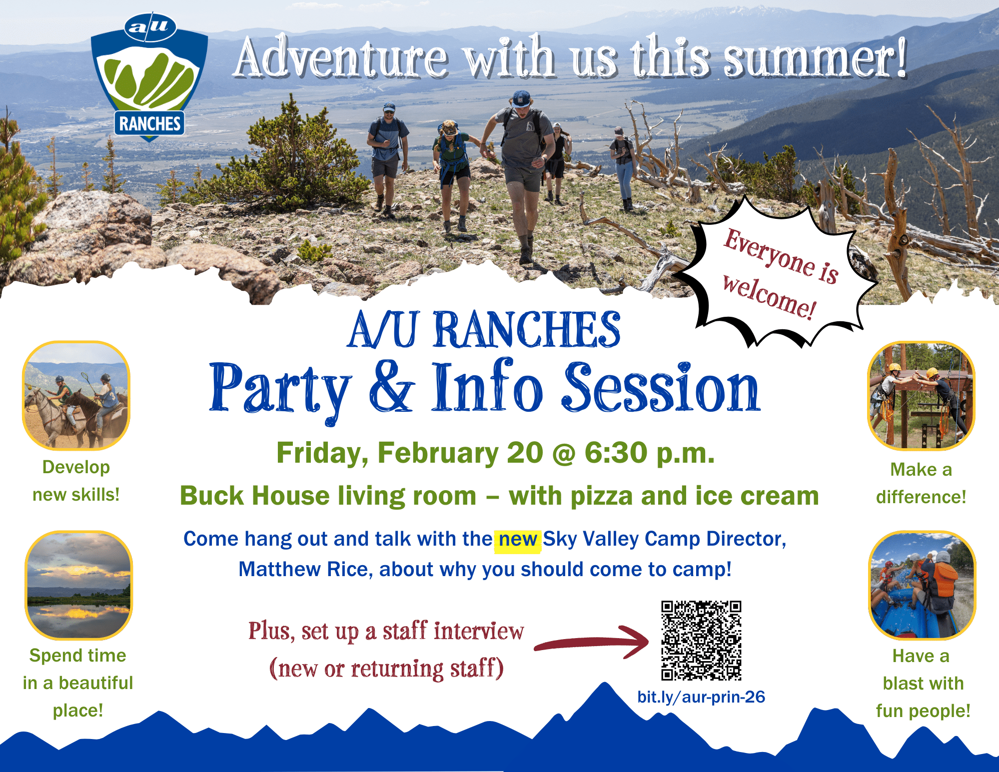 Matthew will be hosting dinner and an info session Friday evening and will be available for staff interviews on Saturday. Come say hello, have some pizza, and get excited about the summer!